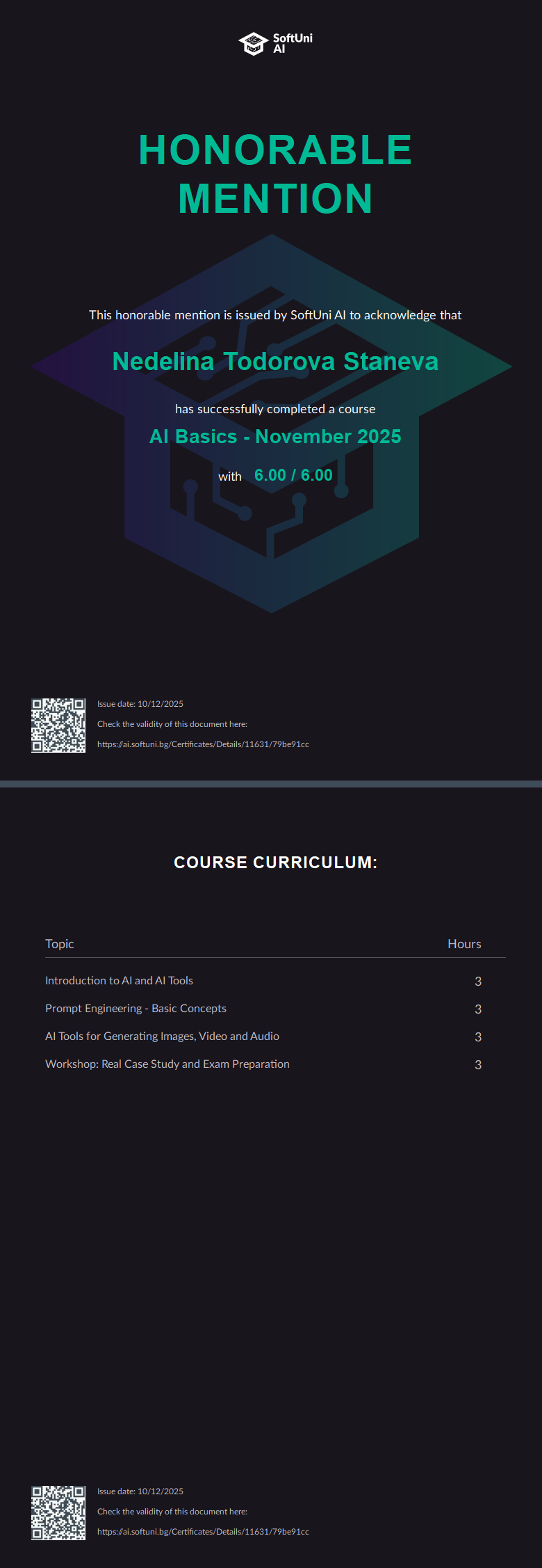 This honorable mention is issued by SoftUni AI to acknowledge that